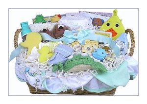 ![]() The "Everything Bath Time" Gift Basket From Pretty Baby Gifts comes with practically everyting you would need for bathtime. A hooded towel and wash mitt, terry cover-up robe, washcloths, a baby handprint kit, animal finger puppets, a ducky wash mitt with soap crayons, baby photo book, terry animal bath loofah, a pair of baby slippers, a fish-shaped infant bath thermometer and an infant brush & comb combination set, and so much more!